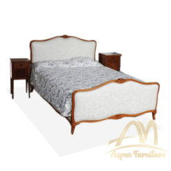 France Bed with Padded Headboard with Upholstered white Fabric and Natural wood Frame color.