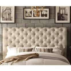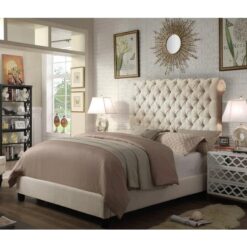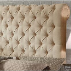 Luxury Bed with Tufted Upholstered Natural Fabric.